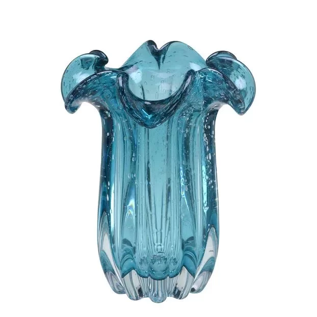 Com um acabamento luxuoso e detalhes trabalhados no vidro, cada peça apresenta formas únicas, cores vibrantes e um brilho sofisticado na cor azul.