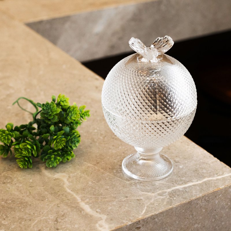 Potiche de vidro com 13cm de altura e a charmosa tampa c0m uma borboleta
