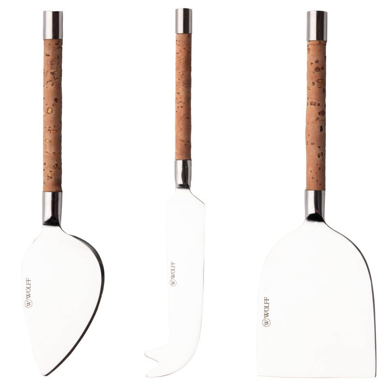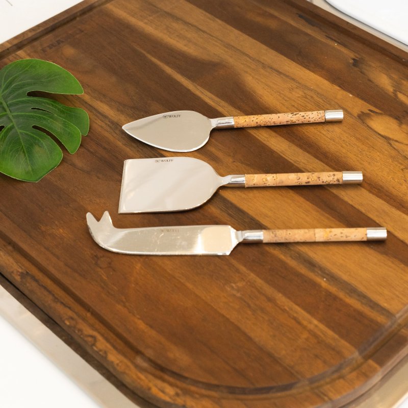 Para receber com charme natural e sofisticação, nossos utensílios unem design contemporâneo ao toque orgânico da cortiça, em aço inox , da marca Wolf Três formatos essenciais para servir diferentes tipos de queijo com elegância e praticidade — um detalhe que transforma sua tábua em um verdadeiro ritual de acolhimento.