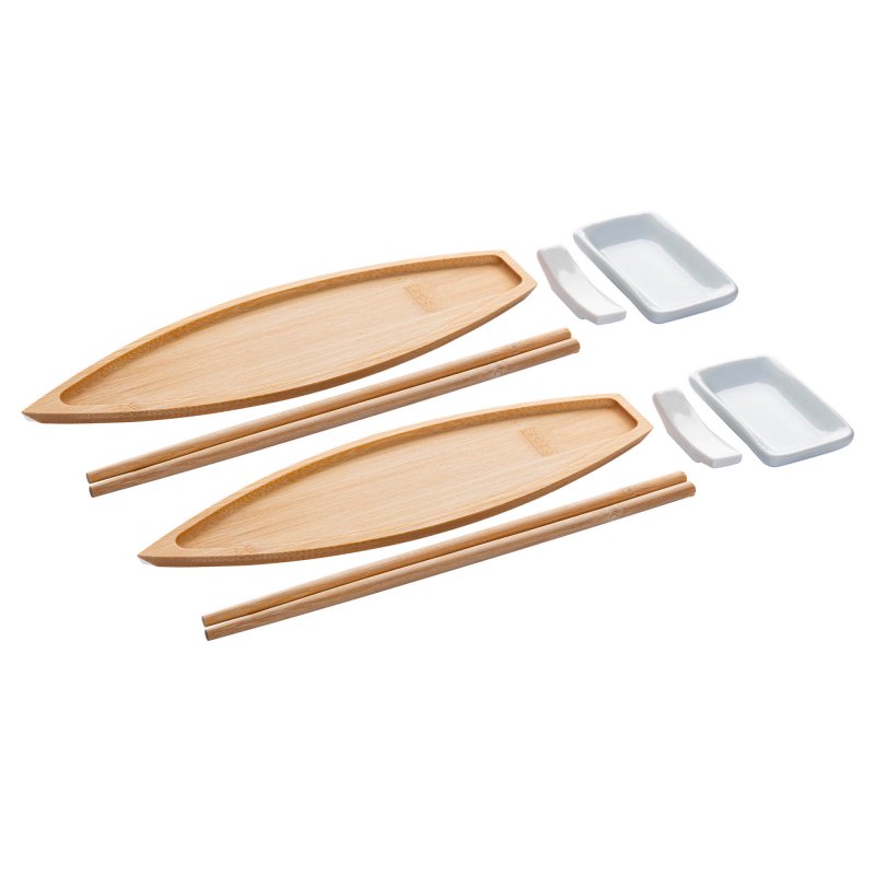 2 barcas em bambu (tabuas de servir)2 pares de hashis (pauzinhos)2 descansos para hashis em cerâmica branca2 molheiras de cerâmica branca