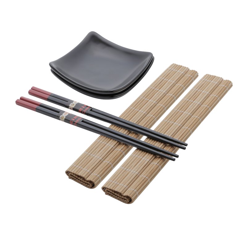 Perfeito para momentos especiais de culinária oriental, este conjunto une praticidade e elegância em um estilo contemporâneo. Ideal para quem aprecia a arte de servir bem. 2 esteiras de bambu (sudare) 2 pratos de cerâmica preta 2 pares de hashis (palitinhos)