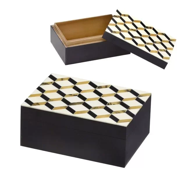 Caixa decorativa em madeira e resina, com desenhos de losangos.