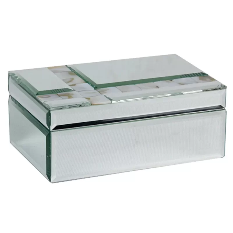 Uma caixa espelhada com madrepérola é um item de decoração que combina o brilho do espelho com a beleza iridescente da madrepérola, resultando em uma peça sofisticada e elegante. A madrepérola, também conhecida como nácar, é uma substância orgânica-inorgânica produzida por alguns moluscos, sendo valorizada por seu lustre e variação de cores..