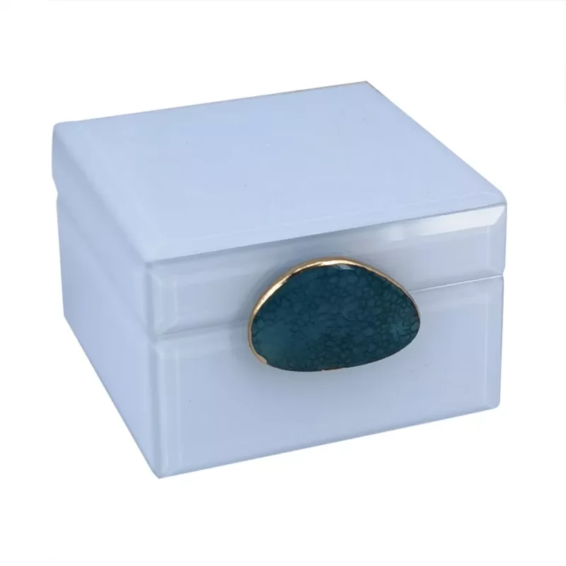 Uma caixa de vidro branca com detalhe em pedra ágata azul é um elemento decorativo que une a transparência e a elegância do vidro branco com a beleza natural e a coloração vibrante da ágata azul. Essa combinação resulta em uma peça sofisticada e versátil, capaz de enriquecer a decoração de diversos ambientes.