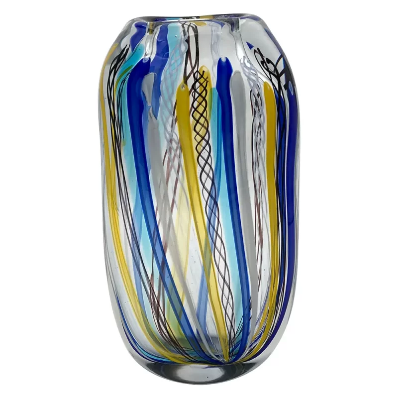 Essa peça é um verdadeiro espetáculo em forma de vaso! Feito em vidro tipo Murano, exibe filetes coloridos em azul, amarelo, branco e preto que criam um efeito riscado artístico e fluido. A transparência do vidro realça a composição e traz sofisticação à decoração. Ideal para quem busca uma peça com personalidade e elegância.