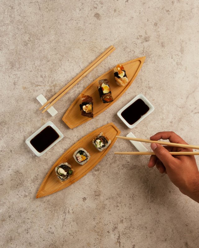 2 barcas em bambu (tabuas de servir)2 pares de hashis (pauzinhos)2 descansos para hashis em cerâmica branca2 molheiras de cerâmica branca